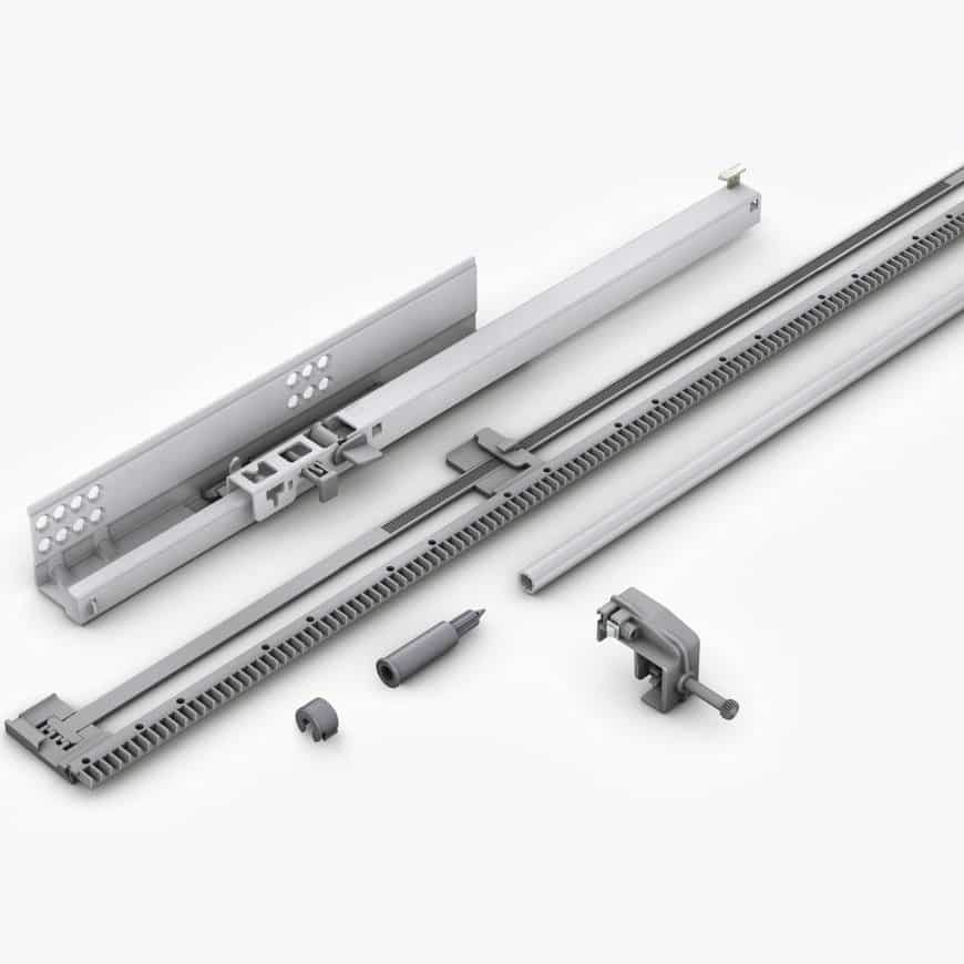Die Flexibilität, gleich mehrere Bewegungstechnologien mit nur einer Führungsschiene zu realisieren, und eine auf die jeweilige Technologie angepasste, optimale Dämpffunktion – das bietet die neue Führung BLUMOTION S für LEGRABOX und MOVENTO.
