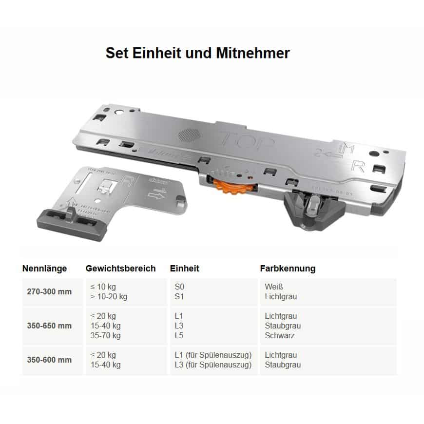 Empfohlene Gewichtsbereiche (Gesamtgewicht des Auszugs) Für eine optimale Öffnungs- und Schließfunktion verwenden Sie die Auswahlunterstützung